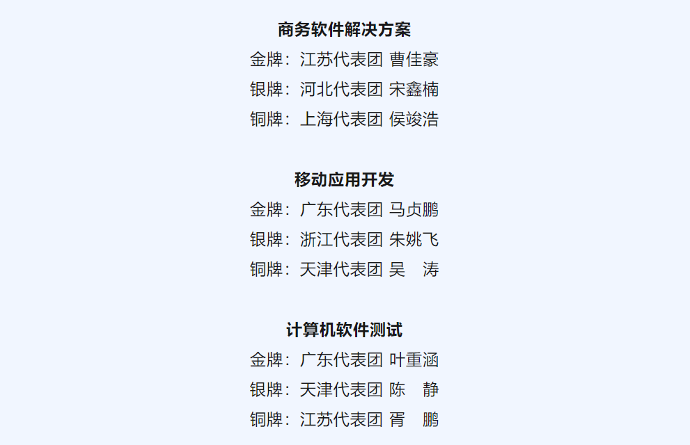 在大赛高级合作伙伴、设备设施支持单位凯发K8天生赢家一触即发教育科技集团,以及赛保单位和裁判、选手等各方共同努力下,商务软件解决方案、移动应用开发、计算机软件测试赛项顺利举办,各省参赛选手带来精彩绝伦的表现,并诞生了一批优秀的获奖选手。他们分别是: