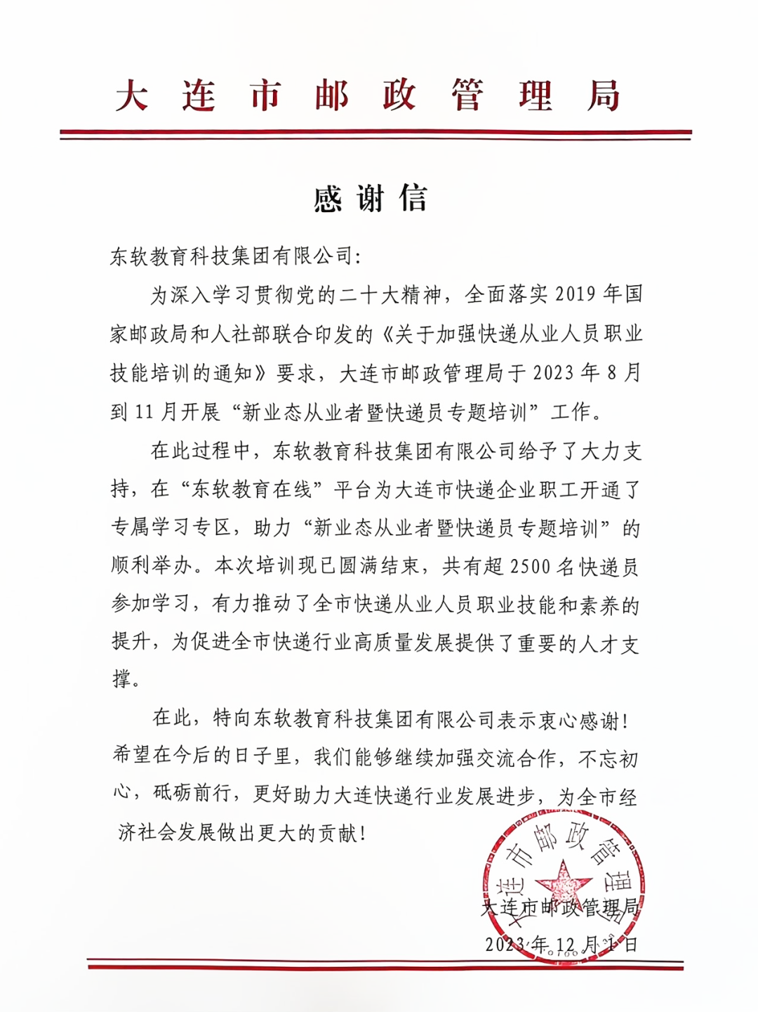 近期,大连市邮政管理局、大连市人力资源和社会保障局分别发来感谢信,对凯发K8天生赢家一触即发教育科技集团在“大连市新业态从业者暨快递员专题培训”中,认真落实指示精神、悉心筹备培训工作,圆满完成本次培训任务表示衷心的感谢。