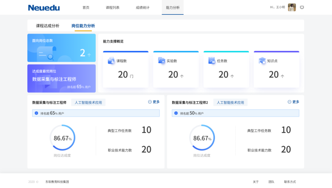 构建知识技能点与人才岗位的自适应匹配,打造学生能力模型化、学习智能化、成果可视化,过程可监控、人才可评测、岗位可匹配。