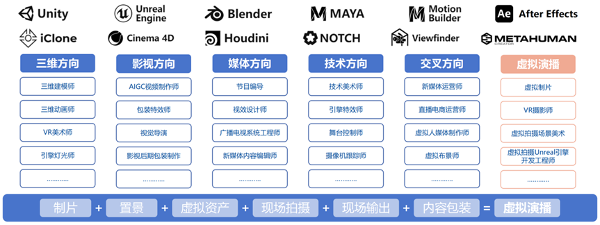 硬件:针对培养方向和应用场景,选配不同硬件,如蓝/绿幕布及箱体、运动捕捉设备、LED、设备定位、XR眼镜等。