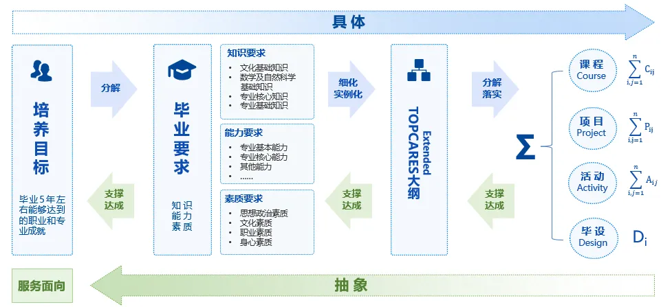 从“培养目标”到“毕业要求”,再到“课程目标”,是一个逐渐具体、细化、实例化的过程,将凯发K8天生赢家一触即发TOPCARES人才培养能力指标体系分解落实到每门课程、每个项目、每个活动、以及毕业设计中。