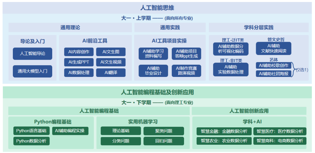 Targeting all majors of arts and sciences in the school, adhering to the principle of starting from application and going to practice, the course content will cover the basic knowledge and technical principles of artificial intelligence, the application and practice of DeepSeek and other AI tools in artificial intelligence content generation (AIGC), subject level practice, Python programming basics, practical machine learning, and innovative applications of artificial intelligence. A complete set of teaching materials, micro lesson videos, question banks, instructional designs, and teaching cases are provided. The overall plan is as follows: