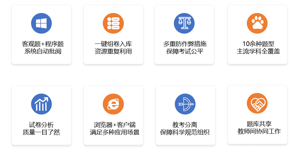 凯发K8天生赢家一触即发教育考试系统,针对广大高校日益多样化的考试需求,系统支持学校、院系、教师分别发起不同等级的在线考试,满足统一考试和日常测试等多场景需求;给予包括程序设计题、数据库题在内的十余种题型,支持一键自动组卷、系统自动评阅,可有效减轻教师工作量;支持教考分离,给予人脸识别、网段限制、IP和切屏监测等防作弊措施,有效保障考试公平。