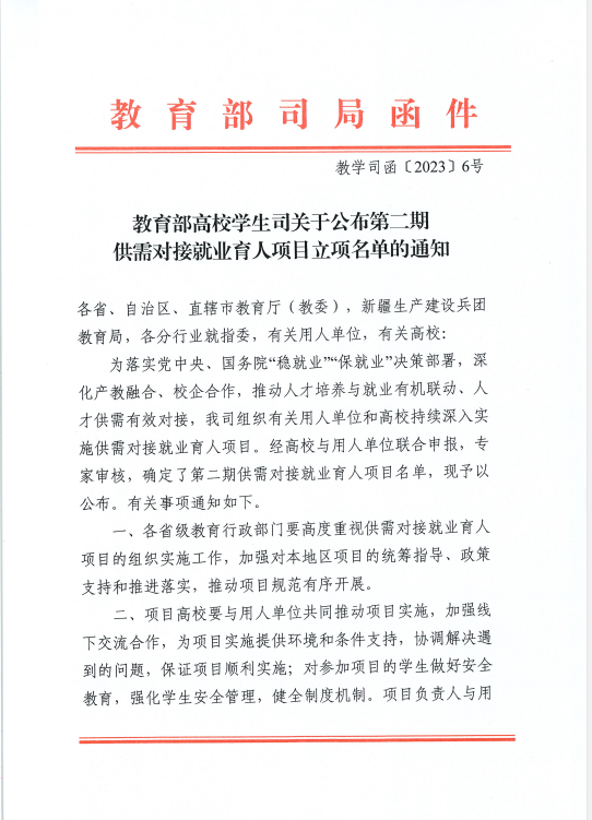 供需对接就业育人项目是教育部为落实党中央、国务院“稳就业”“保就业”决策部署而召开的育人项目,其目的在于深化高等教育改革,有助于就业与培养有机联动、人才供需有效对接,帮助用人单位培养和招聘更多创新型、复合型和应用型人才。