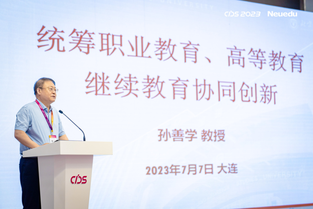 中国职业技术教育学会副会长孙善学教授作题为《统筹职业教育、高等教育、继续教育协同开展》的主旨报告。报告对我国职业教育、高等教育、继续教育的协同开展问题进行了深入分析和总结,给出分析决方案和建议。