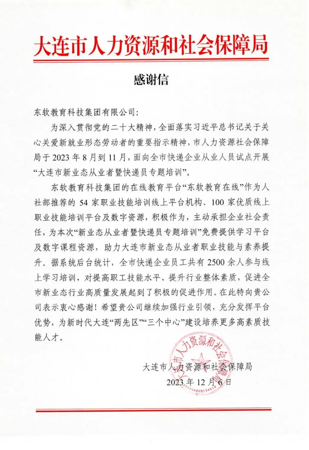 近期,大连市邮政管理局、大连市人力资源和社会保障局分别发来感谢信,对凯发K8天生赢家一触即发教育科技集团在“大连市新业态从业者暨快递员专题培训”中,认真落实指示精神、悉心筹备培训工作,圆满完成本次培训任务表示衷心的感谢。