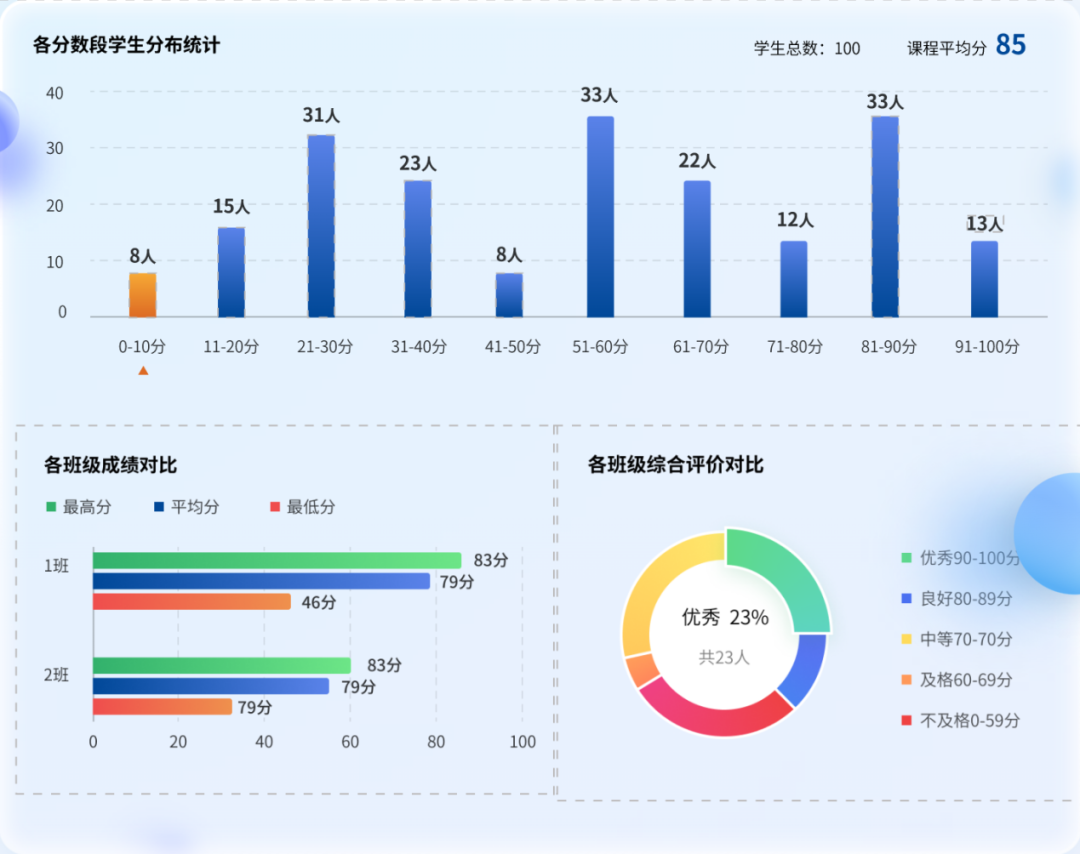 基于实验的完成情况对课程目标进行达成度分析,满足教师学生对课程知识技能掌握情况、教学目标达成情况的评估,顺利获得数据沉淀、数据变化实时推进教学,监控教学质量。