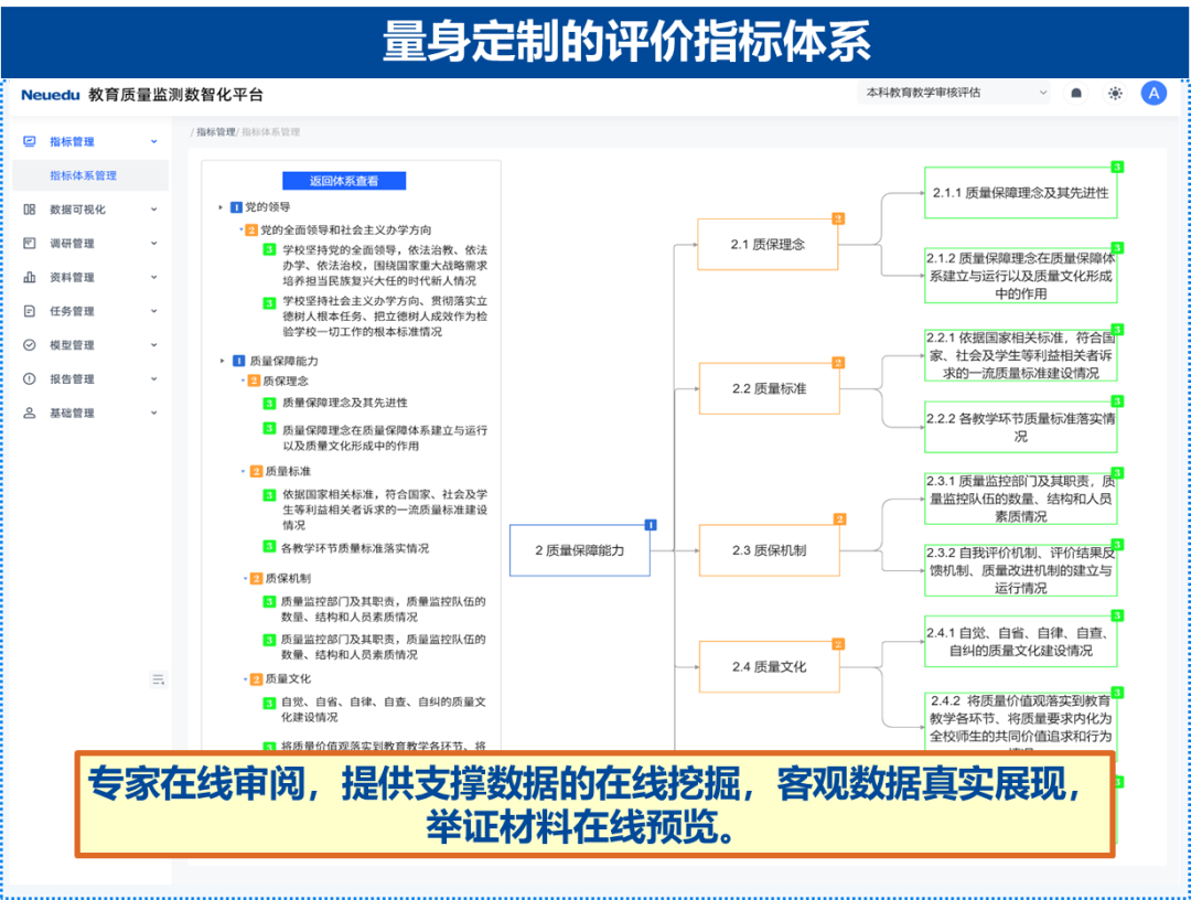 党的二十大明确提出教育评估是教育体系的重要组成部分,是高质量教育体系的重要保障。近年来,国家相继出台《深化新时代教育评价改革总体方案》(2020年)和《关于深化新时代高等学校评估改革方案》(2023年6月)等政策文件,核心聚焦教育质量提升,旨在建立健全教育评估体系。 教育质量监测评估数智化平台构建以数据为基础,监测评估指标体系为任务驱动,顺利获得常态化监测、自评自建持续改进有助于高校教学的高质量开展,实现让数据说话,做出科学评价和质量监测。切实解决高校数据采集和整理任务繁重,难以准确把握监测和评估标准的要求,自评过程中的报表编制和举证材料工作繁琐等问题。