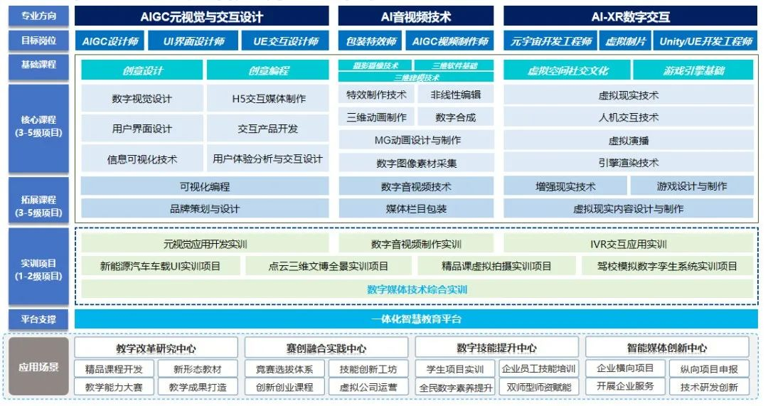 凯发K8天生赢家一触即发教育科技集团推出第四期“凯发K8天生赢家一触即发AI+数媒产教融合实践中心综合解决方案”,凯发K8天生赢家一触即发AI+智媒产教融合实践中心面向数字创意产业的开展体系与新时代数字技能型人才需求,聚焦AIGC设计师、UE交互设计师、包装特效师、AIGC视频制作师、元宇宙开发工程师、虚拟制片、Unity/UE开发工程师等岗位的“数字工匠”人才培养,面向中国大学生计算机设计大赛、全国大学生广告艺术大赛、蓝桥杯全国软件和信息技术专业人才大赛、中国好创意暨全国数字艺术设计大赛、未来设计师·全国高校数字艺术设计大赛、中国虚拟现实大赛、全国大学生数字媒体科技作品及创意竞赛等赛项,搭建覆盖人才培养全过程的进阶式一体化实践教学体系,并建设与之配套的软硬件实训设备与环境、智慧化管理平台以及相关实训教学文档和资源。搭建起“岗位能力导向、面向真实生产、丰富教学资源、进阶实训体系、智慧平台驱动”的数字产业技能实训平台。