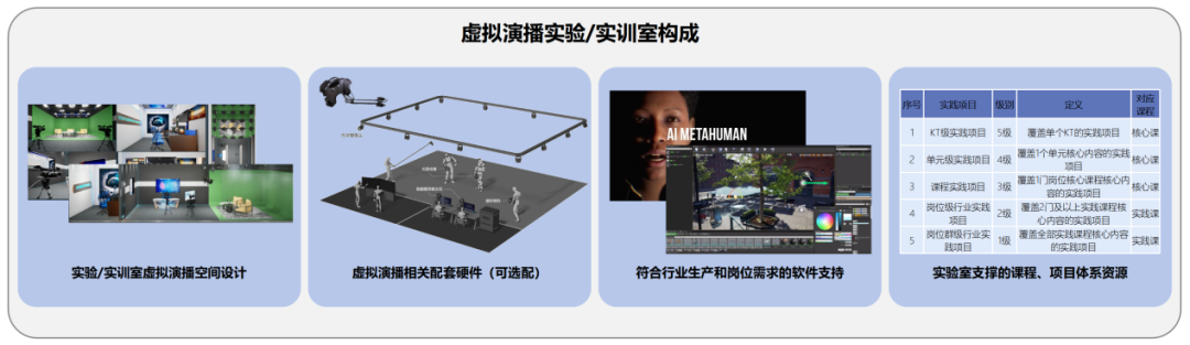硬件:针对培养方向和应用场景,选配不同硬件,如蓝/绿幕布及箱体、运动捕捉设备、LED、设备定位、XR眼镜等。