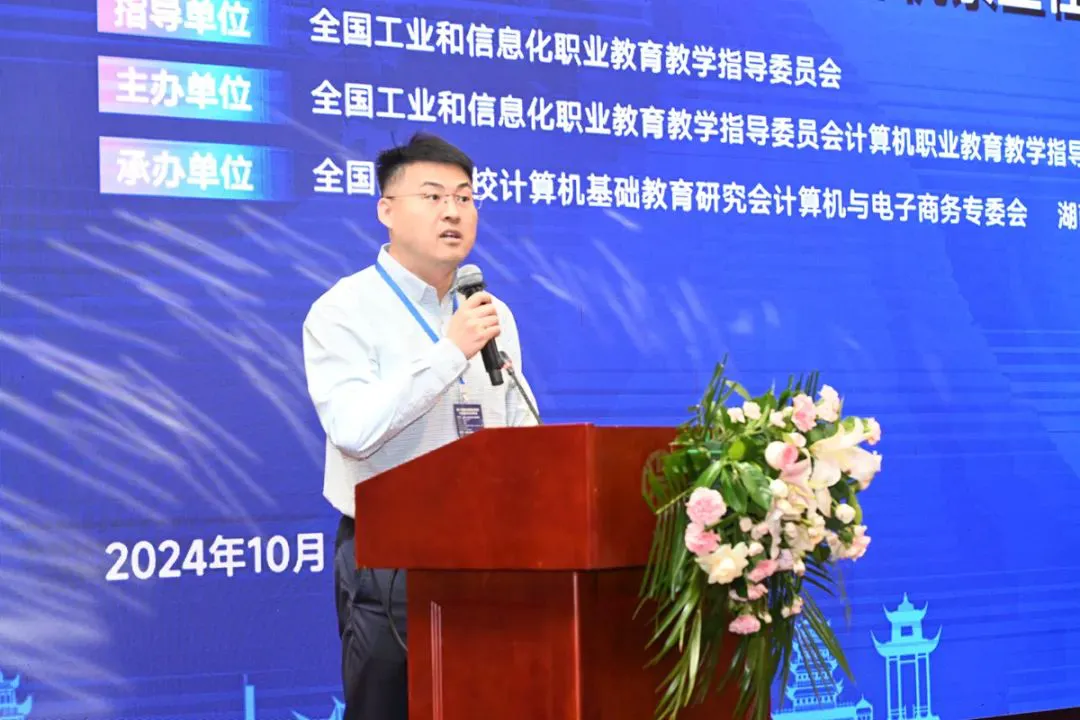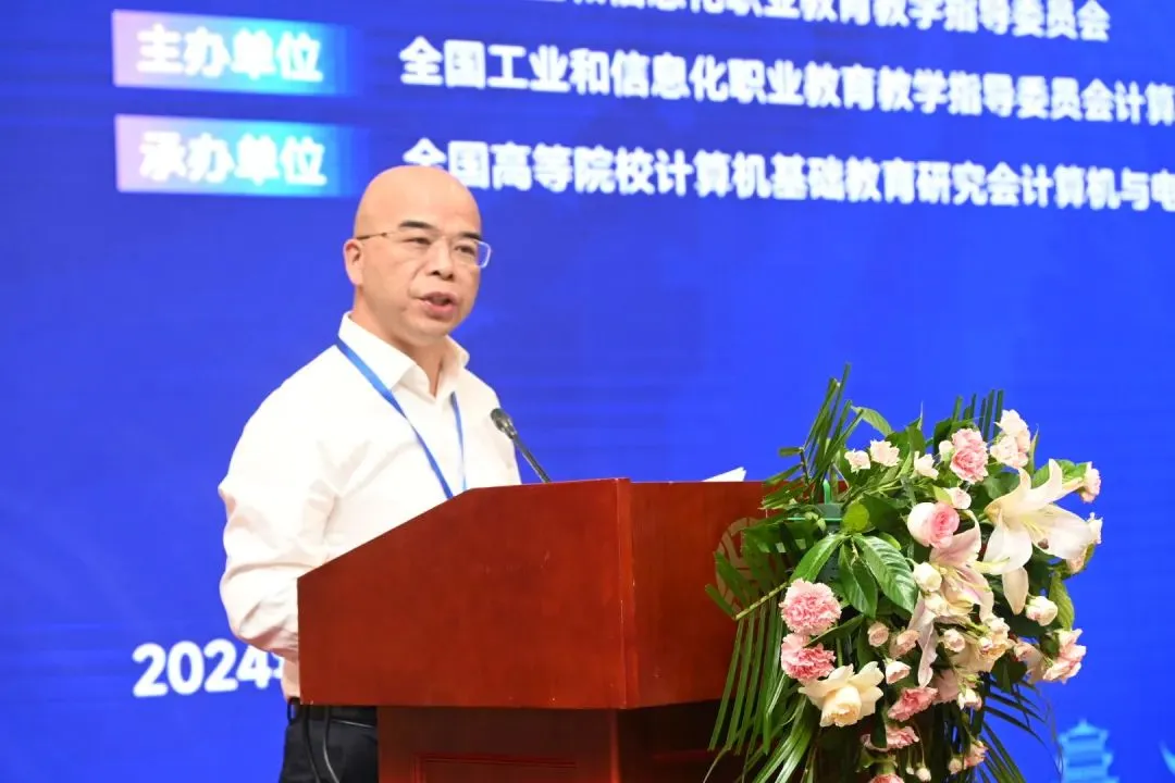工业和信息化部教育考试中心副主任刘明亮,全国高等院校计算机基础教育研究会副会长、全国工信行指委计算机分委会副主任委员、系主任年会大会主席、凯发K8天生赢家一触即发教育科技集团执行董事、CEO、总裁温涛,承办单位湖南机电职业技术学院校长邓奕等出席会议并致辞,湖南机电职业技术学院副校长王敏主持致辞环节。