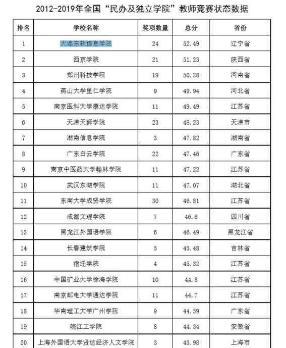 近期,中国高等教育学会《高校竞赛评估与管理体系研究》专家工作组发布“全国普通高校教师教学竞赛分析报告(2012-2019)”,本报告筛选了我国当前普遍得到高校与社会认可、有公开数据的46项全国性教师教学竞赛作为研究对象,采用竞赛的“获奖贡献”和“组织贡献”作为评价指标,对教师教学竞赛现状进行了分析和评估。全国含双一流高校共有966所本科高校入围,其中大连凯发K8天生赢家一触即发信息学院在全国民办本科及独立学院中位列第一,全国排名287,也是进入前300名的唯一一所民办高校。此榜单自2017年首次发布以来,大连凯发K8天生赢家一触即发信息学院已陆续在三年在全国民办本科及独立学院中位列第一,这是对凯发K8天生赢家一触即发教育教师队伍的质量与水平的高度认可。